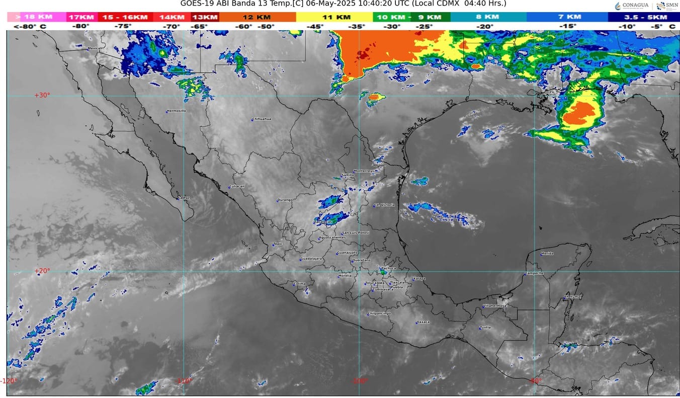 Una circulación anticiclónica en niveles medios de la atmósfera mantendrá el ambiente caluroso a muy caluroso en el territorio mexicano, prevaleciendo la onda de calor en zonas de Nuevo León (sur), Tamaulipas (suroeste), San Luis Potosí (norte, centro y sur), Guanajuato (norte, centro y sur), Jalisco (centro, suroeste y sur), Colima (noreste), Michoacán (oeste, centro y este), Guerrero (noroeste, norte y noreste), Oaxaca (centro y sur), Veracruz, Tabasco, Chiapas, Morelos, Querétaro (centro y sur), Puebla (norte y suroeste), Estado de México (suroeste), Hidalgo, Ciudad de México, Tlaxcala, Campeche, Yucatán y Quintana Roo.