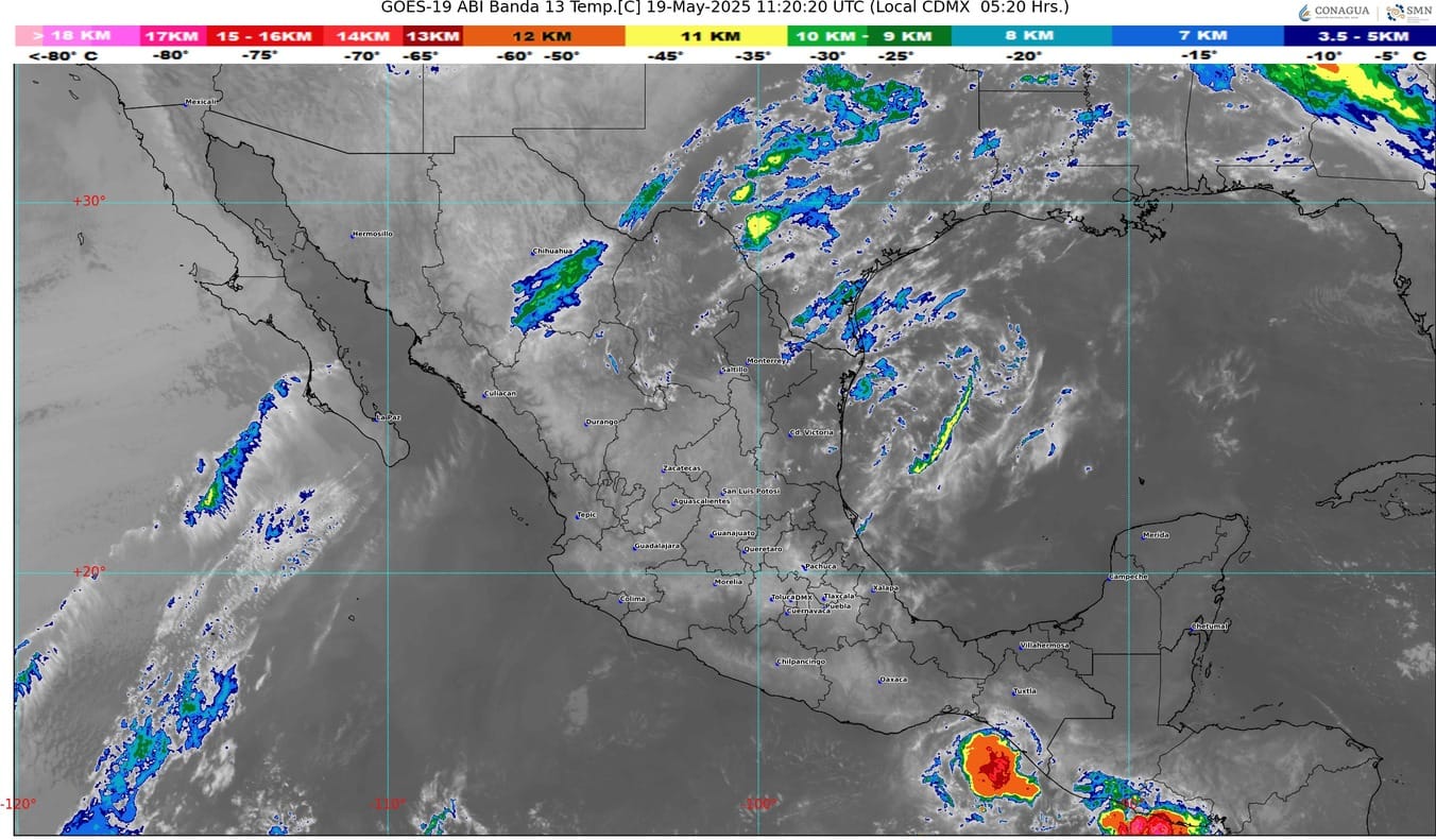 El Servicio Meteorológico Nacional pronostica para hoy, una línea seca prevalecerá sobre el noreste de México, e interaccionará con una vaguada en altura sobre el noroeste del territorio nacional, con las corrientes en chorro polar y subtropical, y con un nuevo frente frío que se aproximará a la frontera norte del país, originando rachas fuertes de viento con probabilidad de tolvaneras en entidades de la Mesa del Norte, así como chubascos con descargas eléctricas y posible caída de granizo en Nuevo León, Tamaulipas y San Luis Potosí.