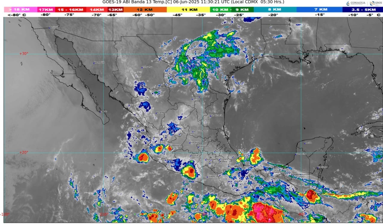Un canal de baja presión sobre la Mesa del Norte y la Mesa Central, en combinación con inestabilidad atmosférica y con el ingreso de aire húmedo del océano Pacífico y golfo de México, originarán lluvias puntuales muy fuertes en Jalisco, Colima y Michoacán; puntuales fuertes en Puebla y Veracruz; y lluvias con chubascos en Nayarit, Hidalgo, Estado de México, Ciudad de México, Tlaxcala, Puebla y Morelos, todas acompañadas con descargas eléctricas y posible caída de granizo; así como lluvias aisladas en Sinaloa, Guanajuato y Querétaro.