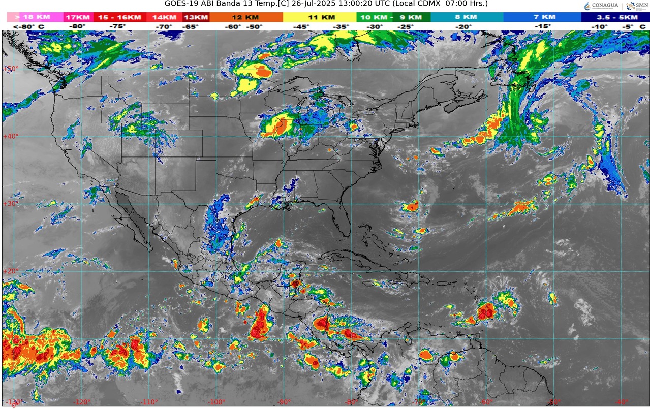 En el occidente, un canal de baja presión y una atmósfera inestable generarán lluvias puntuales fuertes con descargas eléctricas en Michoacán, Colima y Jalisco, mientras que en el centro y sur del país, la onda tropical número 15 y una vaguada en altura originarán lluvias intensas en Oaxaca, Veracruz y Puebla, así como lluvias muy fuertes en Guerrero,