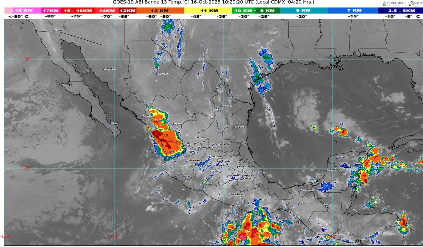 El ingreso de aire húmedo del océano Pacífico y golfo de México, canales de baja presión en el interior del país, así como inestabilidad atmosférica sobre el centro de la República Mexicana, originarán lluvias puntuales muy fuertes en Nayarit y Jalisco; puntuales fuertes en Sinaloa, Durango, Colima y Michoacán; intervalos de chubascos en Puebla, Morelos y Estado de México; y lluvias aisladas en zonas de Tlaxcala, Ciudad de México, Hidalgo, Querétaro y Zacatecas.
