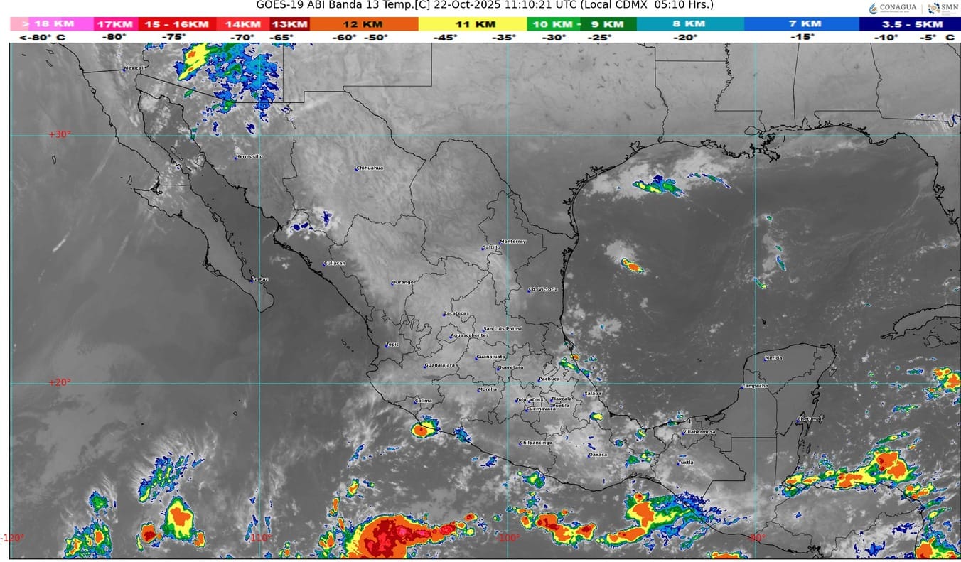 Otro canal de baja presión sobre el interior del territorio nacional, en combinación con el ingreso de humedad del océano Pacífico y golfo de México, ocasionarán lluvias y chubascos en estados del norte, occidente, centro y sur de México.