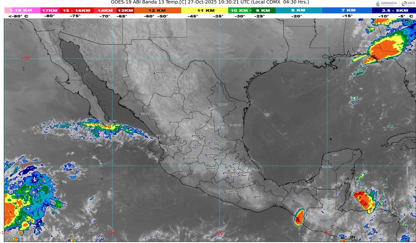 Finalmente, una circulación anticiclónica en niveles medios de la atmósfera sobre la Mesa del Norte, mantendrá baja probabilidad de lluvias en la región mencionada y la Mesa Central, así como un incremento de las temperaturas vespertinas sobre entidades de esas regiones, además del noreste y oriente de México.