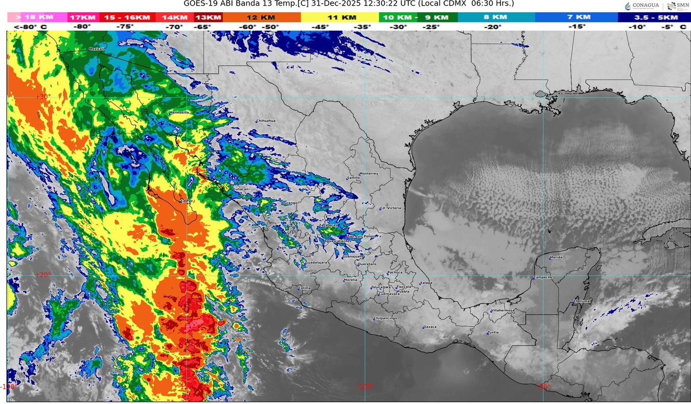 Por otra parte, una vaguada en niveles medios y altos de la atmósfera frente a la costa occidental de la península de Baja California, en interacción con un río atmosférico y con la corriente en chorro subtropical, originarán rachas fuertes de viento, lluvias puntuales muy fuertes en la Península de Baja California e intervalos de chubascos en Chihuahua y Sinaloa, así como probabilidad de caída de nieve o aguanieve durante la noche en la sierra de San Pedro Mártir, B.C.