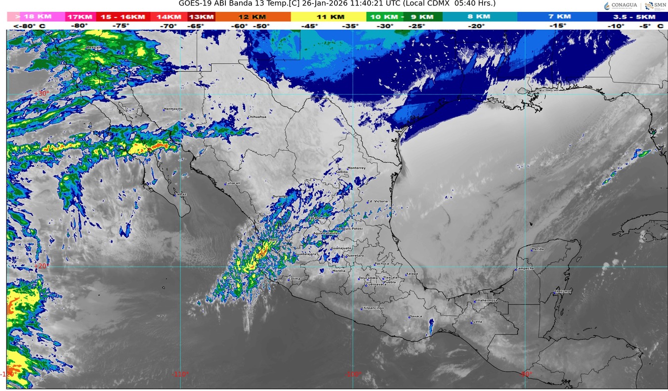 Simultáneamente, la masa de aire ártico asociada al sistema frontal, mantendrá el ambiente frío y bancos de niebla sobre entidades del norte, centro, oriente y sureste del país; así como ambiente muy frío a gélido en zonas serranas de la Mesa del Norte.